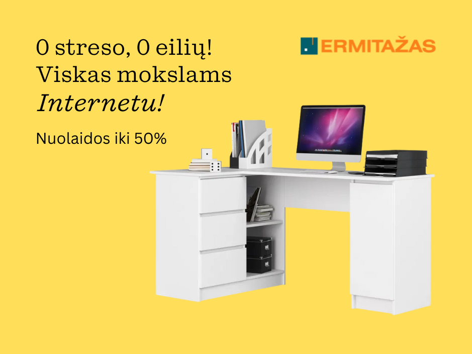 Pasiruošk mokslams be streso su Ermitažu. Iki 50% nuolaidos baldams, taip pat iki 30% nuolaidos nešiojamiems ir planšetiniams kompiuteriams, monitoriams bei dulkių siurbliams perkant internetu. Už prekes nuo 100 Eur atsiskaityk su Inbank Moki!